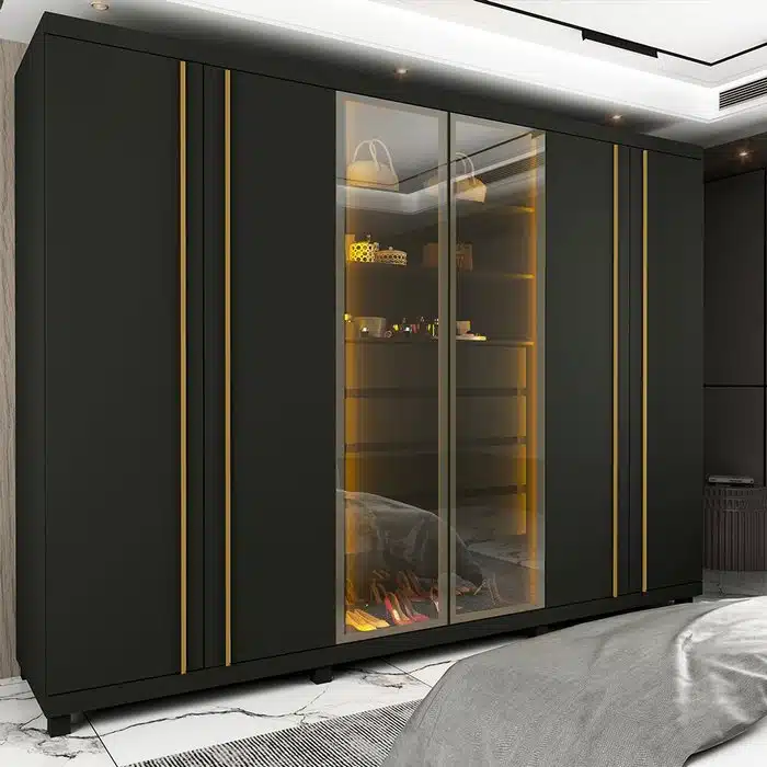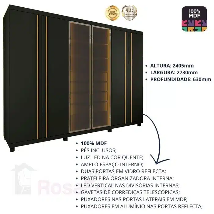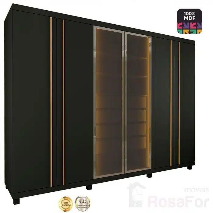 Design Moderno: Possui duas portas centrais em vidro reflecta, com molduras em alumínio, e luz LED vertical em cor quente nas divisórias internas, adicionando um toque sofisticado ao ambiente.