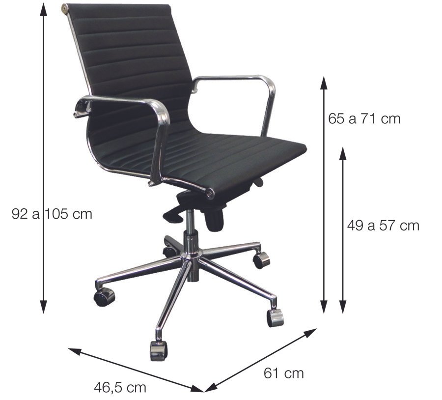 Material: Assento em PU com estrutura cromada. Sistema relax com travamento. Base de encaixe metalizado. Rodas em PU que não danificam o piso. O poliuretano (PU) é um material macio e maleável, ideal para um melhor caimento do estofado. Altamente resistente ao ressecamento, o PU mantém-se macio e agradável ao toque, proporcionando conforto duradouro.