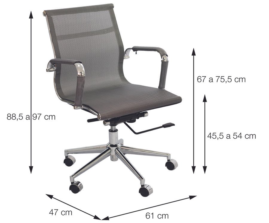 Material: Assento em tela com estrutura cromada. Sistema relax com travamento. Base de encaixe metalizado. Rodas em PU que não danificam o piso