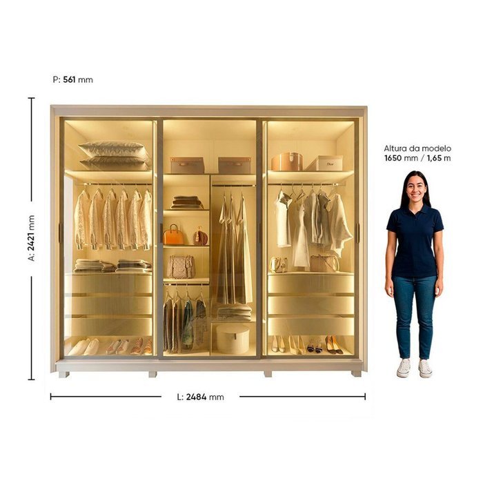 O Roupeiro Platinum 3P é a união perfeita entre inovação, design e funcionalidade. Com portas deslizantes em vidro reflecta, ele traz um toque moderno e sofisticado ao ambiente, além de seguir as principais tendências do mobiliário contemporâneo. O acabamento com requadro em alumínio e iluminação em LED de cor quente nas laterais e divisórias valoriza ainda mais o visual e facilita o uso no dia a dia. Produzido 100% em MDF, conta com seis gavetas com corrediças telescópicas e um interno funcional com divisão ele/ela na elegante cor Off White. Também está disponível com opção de portas em MDF, com kit espelho opcional. Uma solução completa para quem busca elegância, inovação e praticidade no quarto.