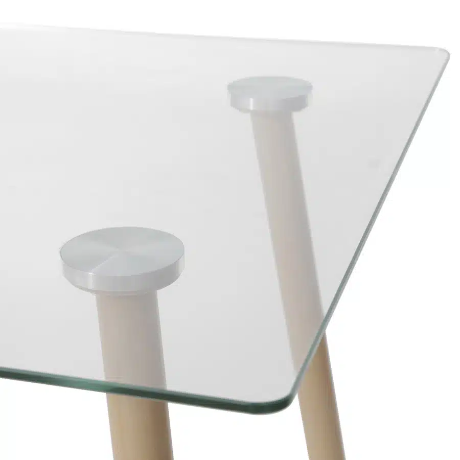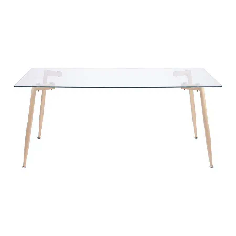 Estrutura em aço com acabamento que simula madeira e tampo em vidro temperado